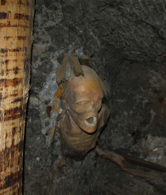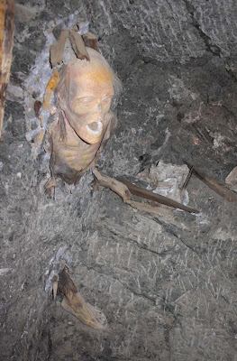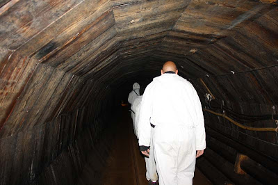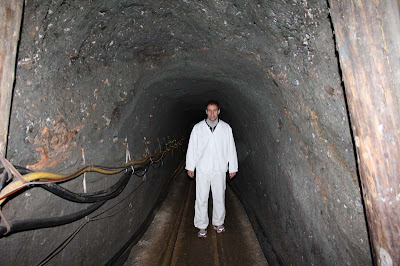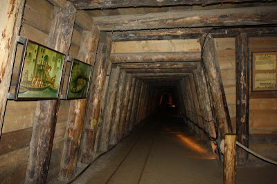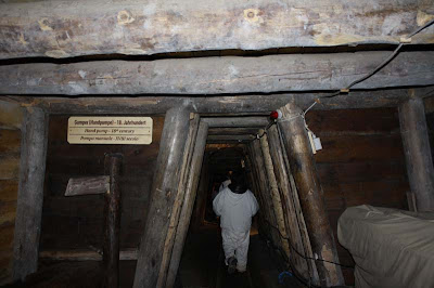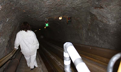 Vi åkte först ett slags tåg in i gruvan. Man satt gränsle över en bänk och höll sig i den framför.
