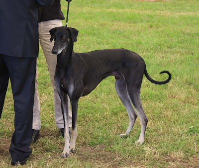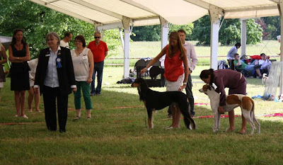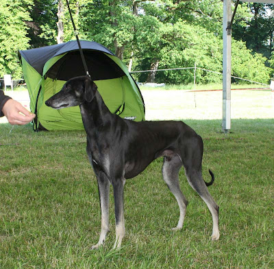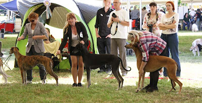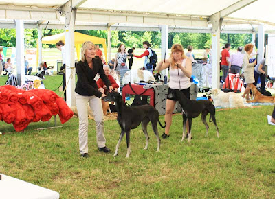 Magyaren som står bakom salukin var den lydigaste vinthund jag sett, och med vilken glädje! Det var en fröjd att se, hur den skuttade omkring med sin handler, lös i ringen efter bedömningen. Inga bakåtstrukna öron, utan verkligen framåt och glad, den lydde för att den ville, inte för att den var tvingad!!