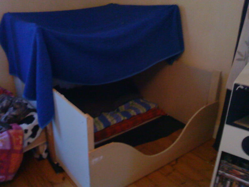 Idag har jag byggt valplådan. Jag har försökt göra den lite mer som en lya, med tak och insynsskydd. Xanni har provat den och redan talat om för de andra hundarna att denna är hennes!