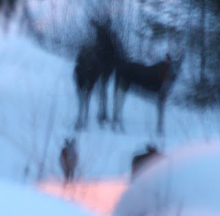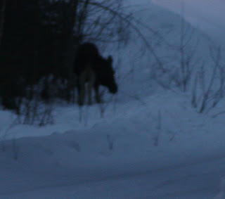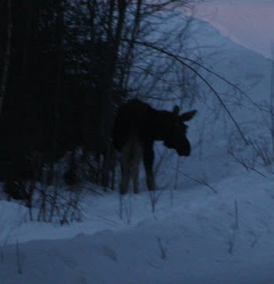 Jag var till och med ut och sprang i snön med bara mina foppatofflor, när fötterna domnade bort gick älgen in i skogen och då sprang jag oxå in.